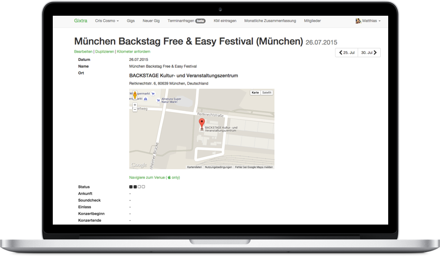 Soundcheckzeit, Adresse des Venues, Reiseplan, Setlist, ... - Du findest alle wichtigen Infos zum Gig auf einen Blick. Kein Suchen mehr nach der Naviadresse in langen Email-Konversationen. Am Tag des Gigs erscheinen die wesentlichen Infos direkt auf der Startseite - so kannst Du auch auf dem Weg zum Auto schnell nochmal die Naviadresse des Venues nachschauen.